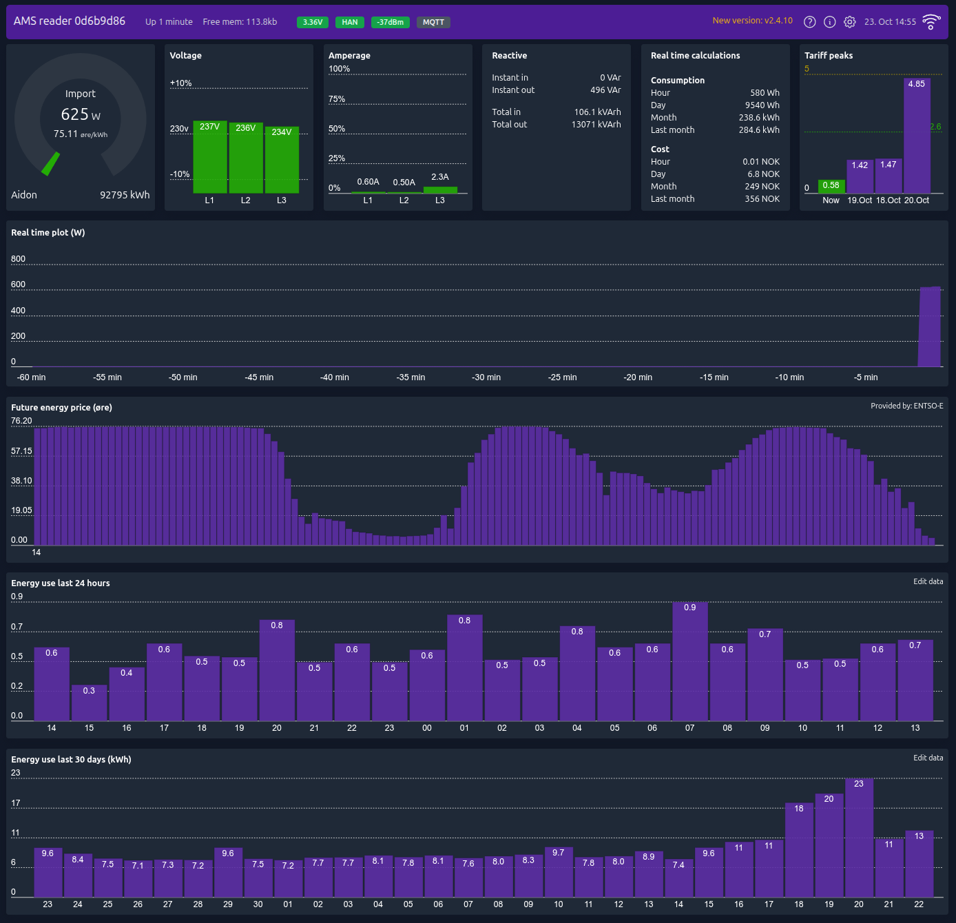 Later development have added Energy usage graph for both day and month, as well as future energy price. The code can run on any ESP8266 or ESP32 hardware which you can read more about in the WiKi. If you don't have the knowledge to set up a ESP device yourself, or you would like to support our work, please have a look at our shop at amsleser.no.