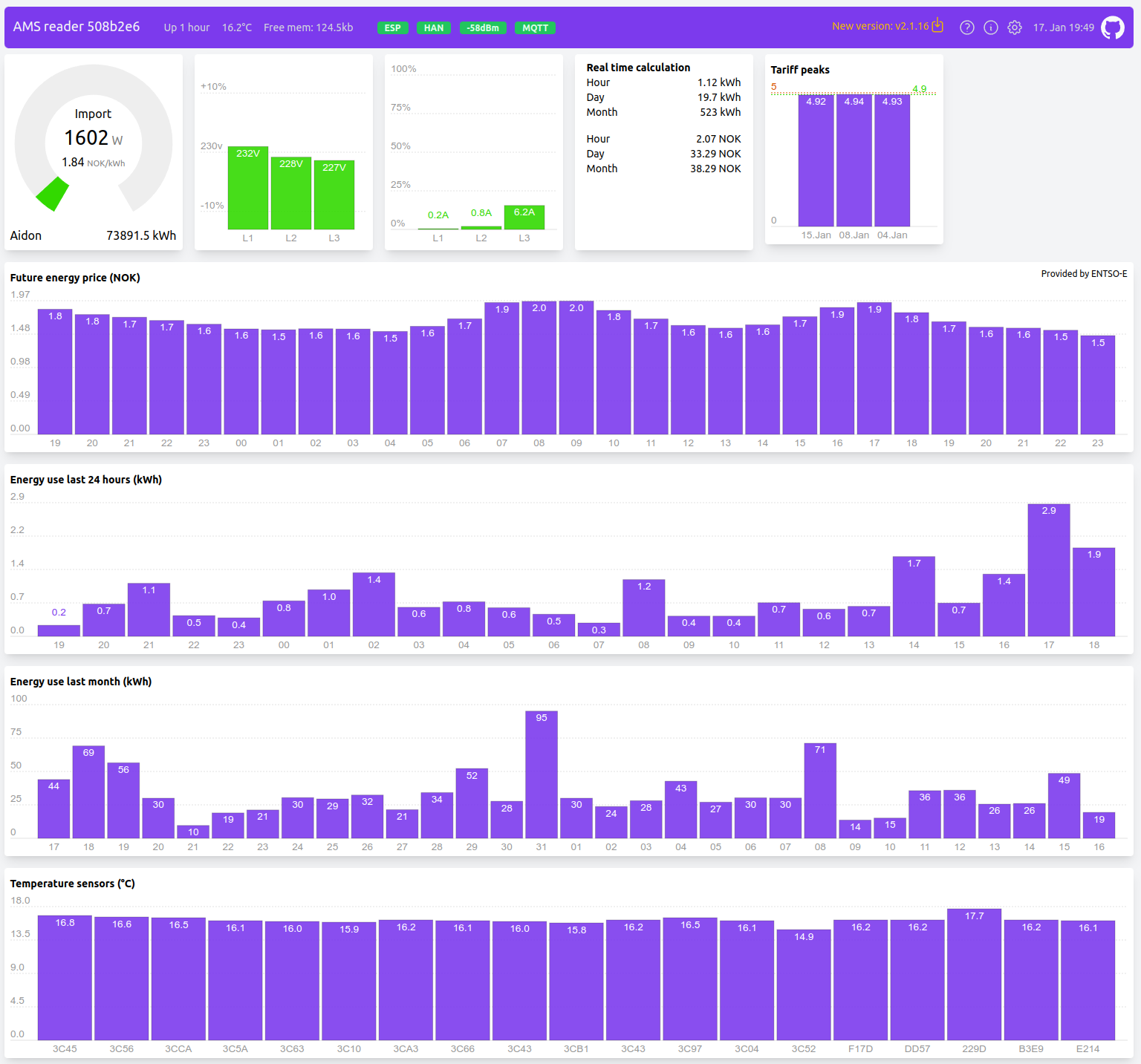 Later development have added Energy usage graph for both day and month, as well as future energy price. The code can run on any ESP8266 or ESP32 hardware which you can read more about in the WiKi. If you don't have the knowledge to set up a ESP device yourself, or you would like to support our work, please have a look at our shop at amsleser.no.
